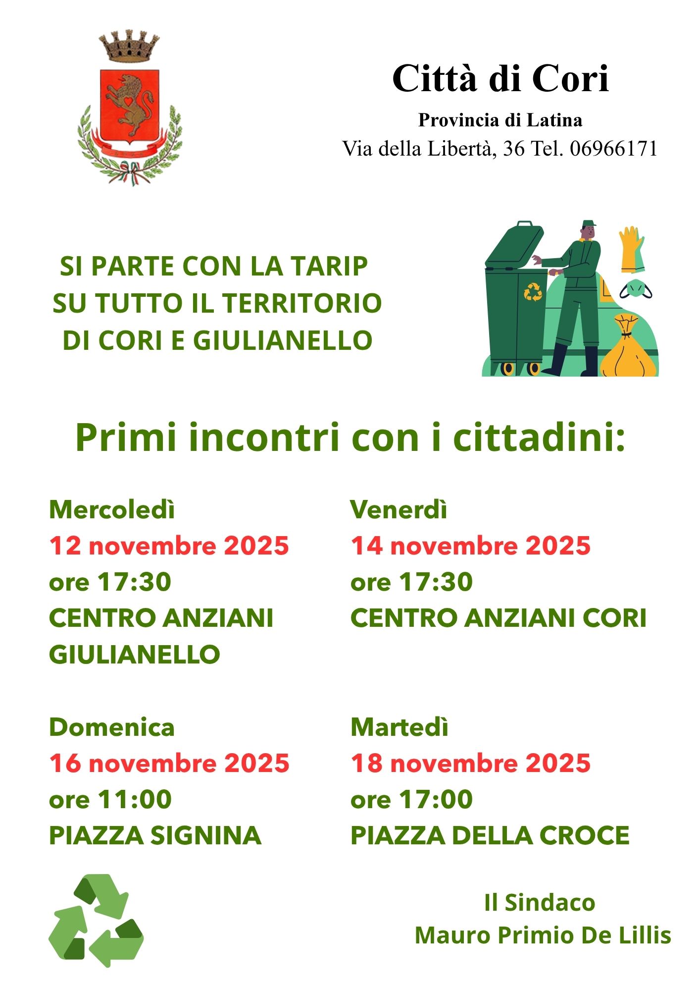 Il Sindaco incontrerà i cittadini nell seguenti giornate :